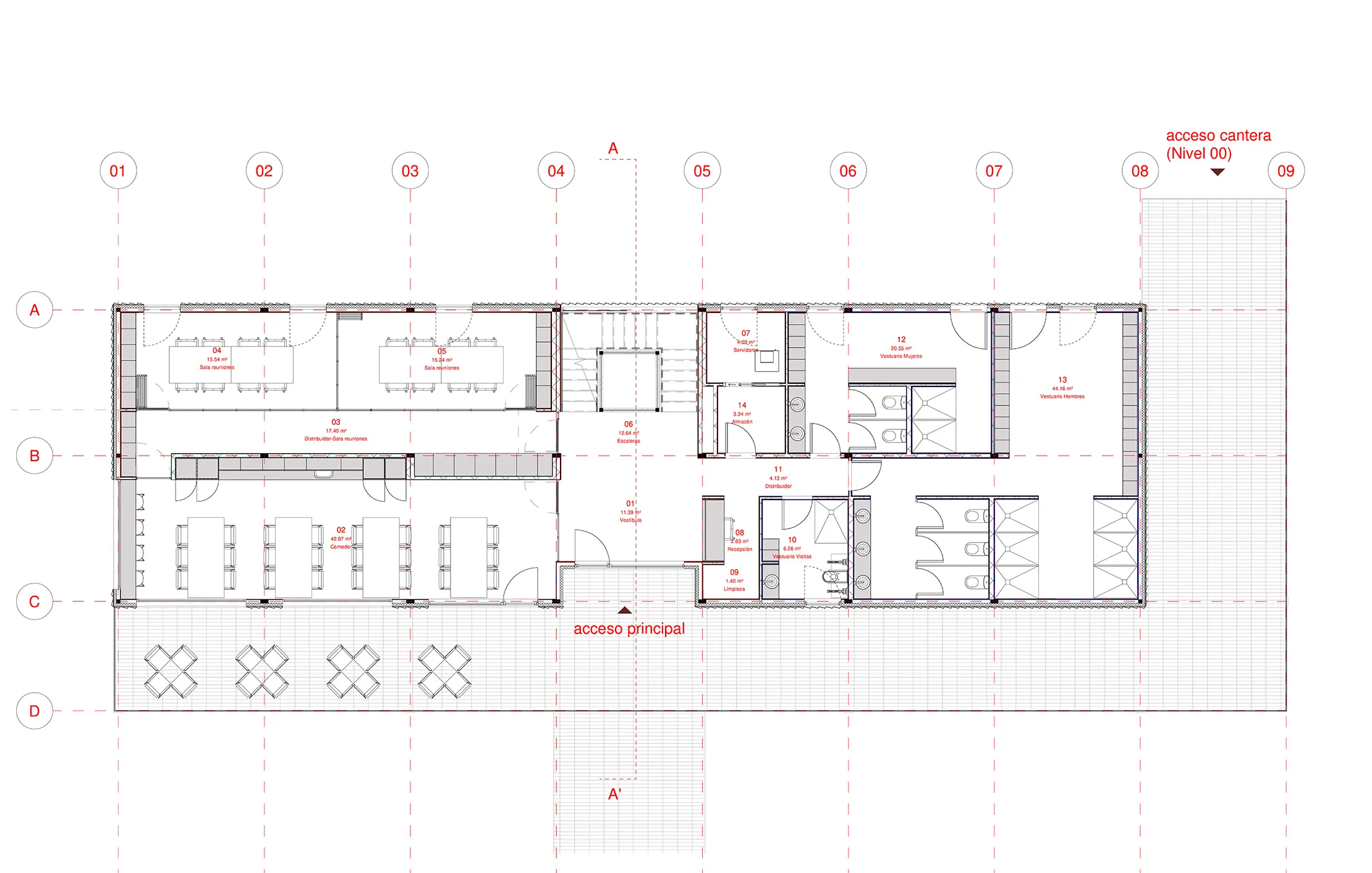 El edificio se divide en tres áreas principales: área general, de ocupación habitual y esporádica. La planta baja alberga la zona general, con vestuarios, comedor y salas de reuniones, diseñadas para separar las circulaciones y evitar la entrada de polvo en los espacios nobles. La planta primera se destina a la ocupación habitual, con oficinas que combinan espacios abiertos y cerrados, y despachos de uso privado.