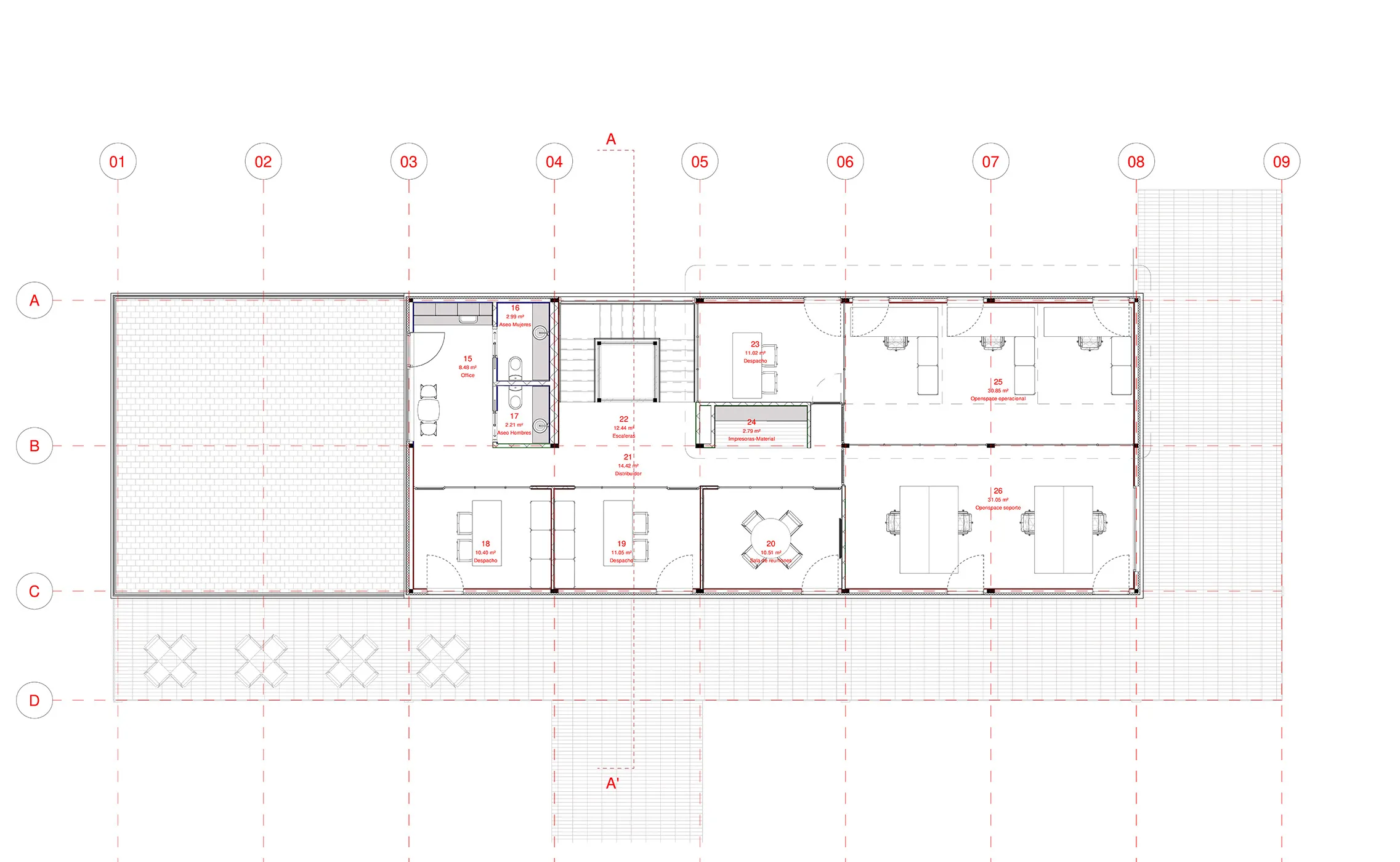 La solución modular prefabricada facilita la personalización y adaptación del espacio a las necesidades del programa, permitiendo dividir los espacios de oficina con elementos móviles para generar zonas más privadas o abiertas. Este enfoque modular mejora la eficiencia en la construcción, ya que se fabrica de manera estandarizada y se ensambla rápidamente in situ, lo que reduce costos y tiempos de construcción.